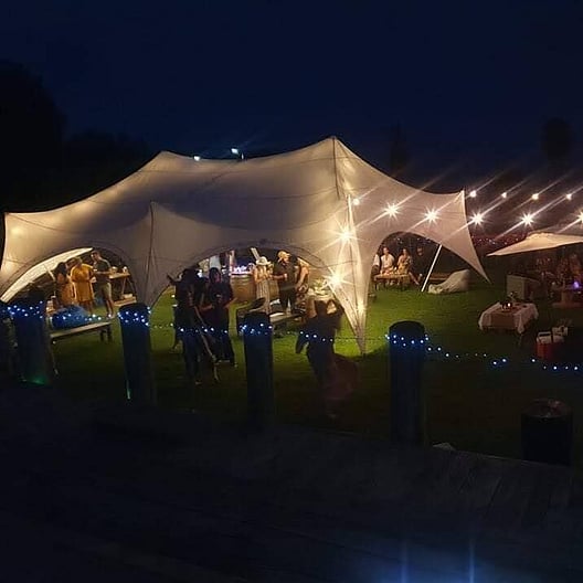 The 11.5x8.5 Capri marquee, is our largest marquee with a size of 11.5 meters by 8.5 meters. Its unique and one of a kind design that is the perfect starting point in creating your special event. It is ideal for large party's, 21st and small weddings. It can seat up to 64 people, with our 1.6 meter round tables and 1.8 meter long tables or stand up to 80 people with an indoor - outdoor flow. It also has the option to have walls on it. The Capri marquee is installed by our professional Chill Out team and can go on grass or concrete.
