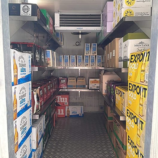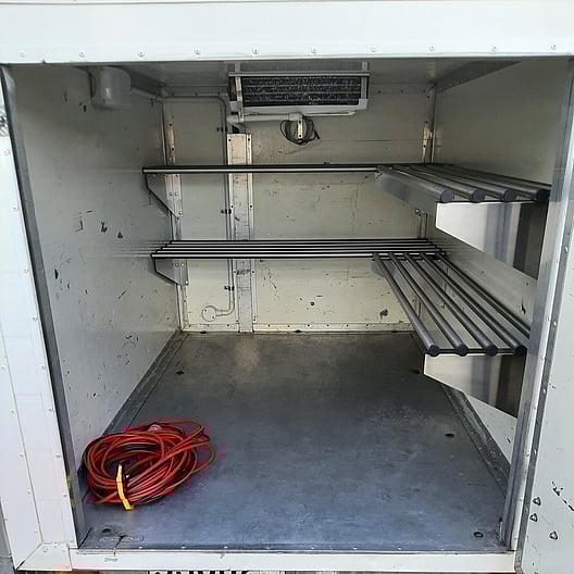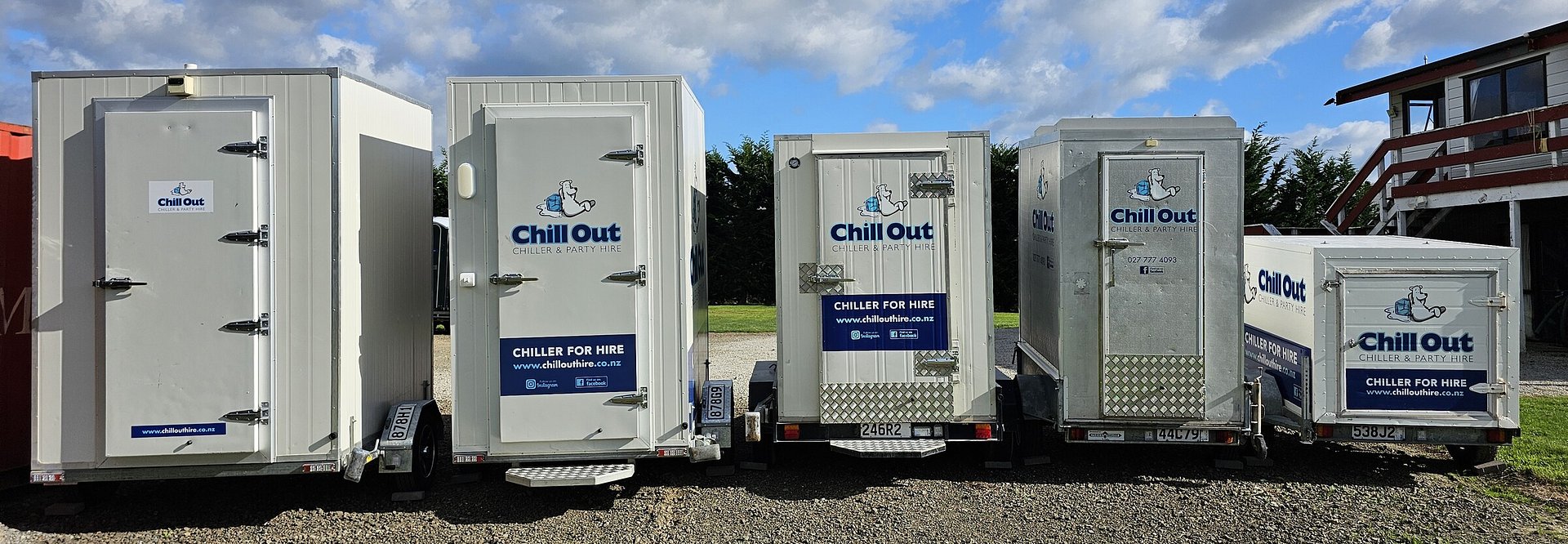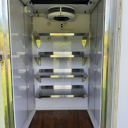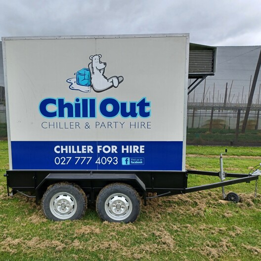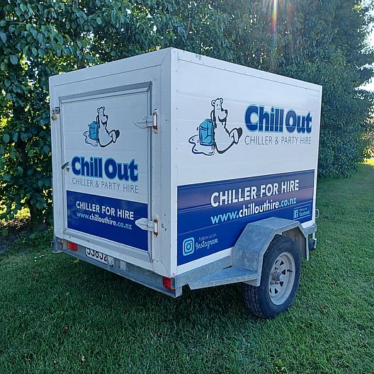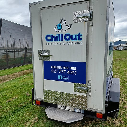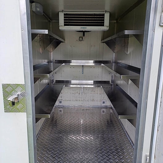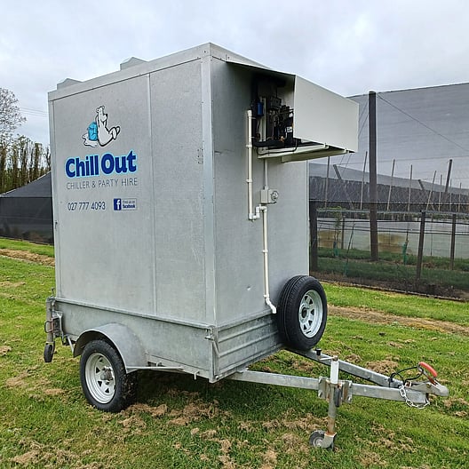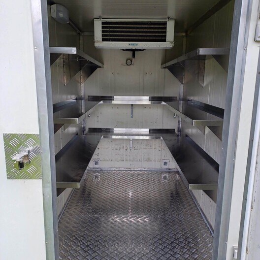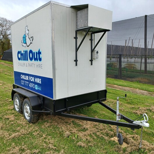 Our large chiller trailer, is perfect for large weddings and catering events with shelving covering all side walls. It is situated on a tandem trailer with a rear stabilizer leg, lockable door and hitch. It has an internal built in light and is supplied with an extension lead. Its box size is 2400mm long by 1500mm wide.