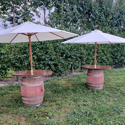 Our elegant timber cream umbrellas, keeps the sun away and sets off a level of style. These go extremely well with our wine barrel leaners.
