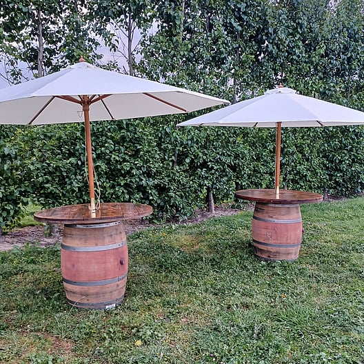 Our elegant timber cream umbrellas, keeps the sun away and sets off a level of style. These go extremely well with our wine barrel leaners.